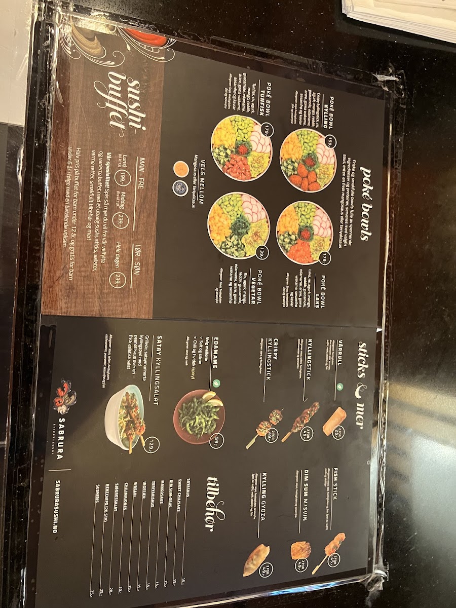 From a reviewer’s perspective, the menu at Sabrura Sticks & Sushi Roseby offers a broad and satisfying selection that highlights both classic sushi and modern fusion options. The sashimi selection, including Sashimi Laks, Sashimi Kveite, Sashimi Tunfisk, and Sashimi Miks, provides fresh and clean flavors, while the maki range such as Bitamaki, Tempura Futomaki, Nordkappmaki, Frostamaki, and Laksemaki offers variety for both traditional and adventurous diners. The combination menus like Stor Makimeny, Hot Kombo, Stickskombo, Medium Makimeny, and Liten Kosekombo are convenient options for those who want a curated tasting experience. The Poké Bowl Tunfisk, Poké Bowl Kylling, Poké Bowl Laks, and Green Poke Bowl add a fresh and modern touch, while nigiri options such as 2 Stk. Nigiri Kveite, 2 Stk. Nigiri Fusion Laks, 2 Stk. Nigiri Tunfisk, 2 Stk. Nigiri Scampi, and 2 Stk. Nigiri Laks showcase simple, quality ingredients. For something different, the Sushiburrito Med Scampi, Sushiburrito Med Kylling, Sushiburrito Med Laks, Sushisandwich Med Kylling, and Sushisandwich Med Laks are creative and filling alternatives. Smaller dishes like 2 Stk. Satay Kyllingspyd, 2 Stk. Kyllingklubber, 2 Stk. Tempura Scampi, and 2 Stk. Kylling Gyoza work well as sides, especially when paired with extras like Ingefær, Teriyakisaus, Chilimajo, Rekechips, and Wasabi, and drinks such as Coca-Cola, Coca-Cola Uten Sukker, MER Pære, San Pellegrino Aranciata, and Fentimans Ginger Beer complete the meal nicely. Overall, the menu is diverse, well-rounded, and suitable for both sushi lovers and those looking for warm Asian-inspired dishes.